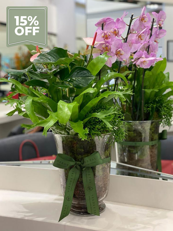 O arranjo contém orquídeas phaleanopsis da estação e mix de plantas verdes em um elegante vaso de vidro, flores sempre lindas que trarão sorrisos para quem recebe!