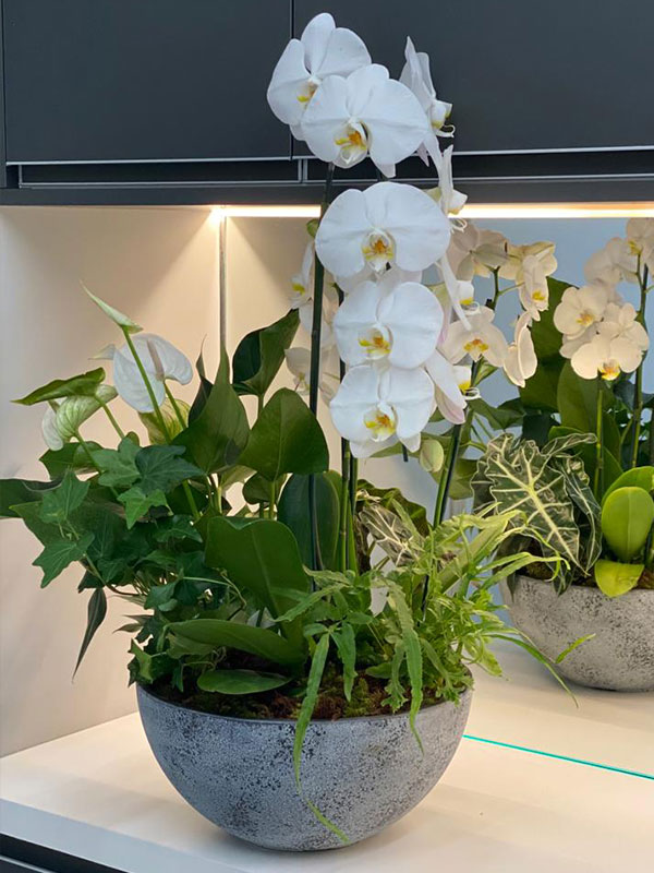 O arranjo contém orquídeas phaleanopsis da estação e mix de plantas verdes em um vaso elegante, flores sempre lindas que trarão sorrisos para quem recebe!