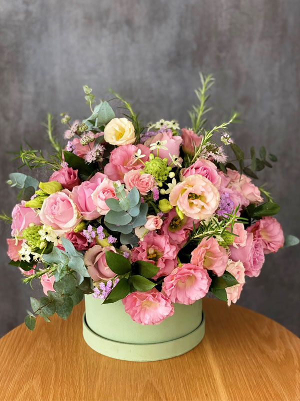 Alecrim, Eucaflor, Lisianthus, Rosas, Boca-de-Leão, Ornitoghalum e Statice.